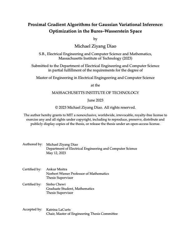 Diao, Michael Ziyang. 2023. “Proximal Gradient Algorithms for Gaussian Variational Inference: Optimization in the Bures–Wasserstein Space.” Master’s thesis, Massachusetts Institute of Technology.